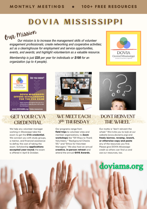 DOVIA Central Mississippi (Directors of Volunteers in Agencies) is a networking group of professionals who meet monthly to discuss volunteerism topics of all types, troubleshoot our volunteer programs, support each other, and learn new skills. In short, our DOVIA provides Central Mississippi’s volunteer managers with the tools they need to do their jobs better.